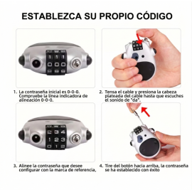 CABLEMEMO de Ø4 con una longitud de hasta 120cm de regalo. Incluye adaptador en T para cascos con hebilla de liberación rápida. Mosquetón diámetro 11. Ligero y fácil de transportar. Bloqueo personalizable de 4 dígitos. Recubrimiento plástico para evitar rozaduras indeseadas.