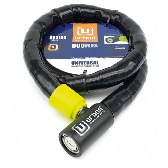 Antirrobo Urban UR5100 Duoflex 100 cm. El antirrobo Urban UR51 Duoflex está diseñado para ofrecer ligereza y resistencia. El candado Urban Duoflex está fabricado con un resistente cable de acero asegurado por casquillos y bolas de acero blindadas de diámetro 25mm. Estos casquillos le confieren flexibilidad sin perder resistencia. Además, está recubierto por una funda plástica especialmente diseñada para evitar roces. Gracias a sus dimensiones totalmente universales, el Urban Duoflex lo puedes utilizar tanto en moto, scooter o bici. Incluye tres llaves planas reversibles de seguridad. Urban pone a tu disposición dos medidas de su Duoflex, la referencia UR5100 de 100 cm y la UR5120 de 120