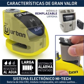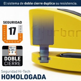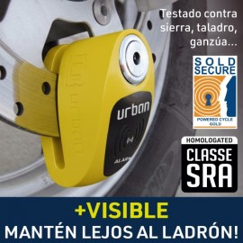 URBAN UR910Y es un candado moto con alta visibilidad amarillo+negro que disuade a primera vista y deja claro que tu moto está protegida. Homologado SRA y Sold Secure Gold, combina perno Ø10 mm con doble cierre, acero inoxidable pintado y alarma 120 dB ON/OFF para aparcar en la calle con tranquilidad. Frente a ataques reales, el doble bloqueo inmoviliza el eje por cerradura y base, la cerradura de discos cuenta con protección anti-taladro y anti-ganzúa, y el conjunto resiste palanca, golpes, sierra y torsión, haciéndolo más difícil de forzar. Tú decides cuándo usar la alarma de este antirrobo moto: actívala con doble pulsación; su aviso progresivo permite desactivarla a tiempo antes del volumen máximo. También puedes usarlo sin alarma cuando prefieras discreción; si buscas mayor sensibilidad al toque, valora UR10, UR999 o UR14S. Diseñado para durar: electrónica sellada y resistente al agua, batería CR2 de larga duración y módulo UR91MA reemplazable para no cambiar el candado entero. Listo desde el primer día con 3 llaves, cable recordatorio y llave Allen incluidos.