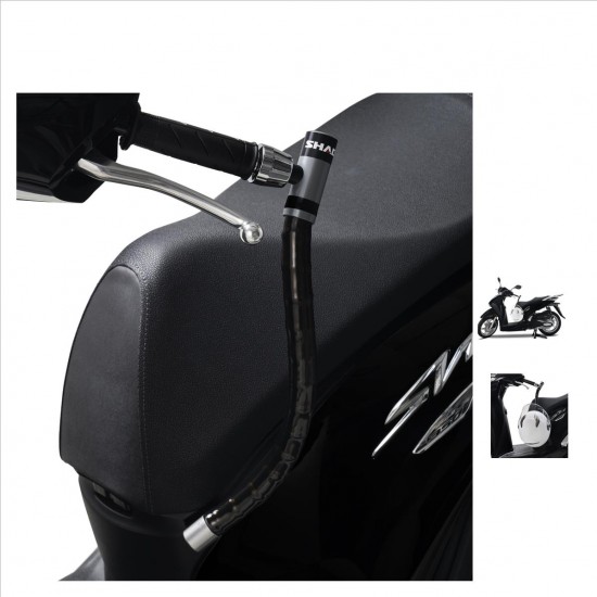 Antirrobo de manillar SHAD LOCK (patentado) para scooter SERIE 3. Solución antirrobo compuesta de un candado y una fijación a tu moto. El candado reposa en su fijación bajo el asiento y se acopla al manillar para inmovilizar el vehículo. Un sistema limpio, rápido y práctico (permite guardar el casco) que una vez instalada la fijación a la moto se acopla el candado. . Cierre de alta calidad (hasta 30.000 ciclos garantizados) y su llave reversible para una manipulación más rápida. . Candado de rótulas que cubren un cable de acero galvanizado de 5 mm. . Ubicación lateral de la llave para mejorar la usabilidad. . Cabezal rotativo 360º. . Montaje invisible entre cabezal y cadena. . La SERIE 3 está compuesta de 3 referencias. Consulta la adecuada para tu moto: o C0S307H = 49 CM o C0S305H = 44 CM o C0S303H = 38 CM . Solución rápida y práctica, ya que permite acoplar el casco y dejarlo protegido en la moto. . Complemento ideal para tus recorridos diarios por ciudad o interurbanos. . El logotipo y otros gráficos están impresos. . Producto diseñado 100% en Europa. . Cumple con la normativa REACH.