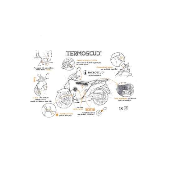 Termoscud es un cubrepiernas o una manta térmica para scooter, una solución práctica y efectiva para coger la moto cuando hace frío. Se puede utilizar también para tapar el asiento de la moto cuando está aparcada y protegerlo así de la humedad y la suciedad. Se puede montar y desmontar muy fácilmente.