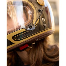Casco integral con carcasa de fibra de carbono en 2 tamaños, relleno multi-densidad, y visor inyectado. Cuenta con ventilación, cierre de doble hebilla, interior desmontable y lavable, sujeción para gafas, pantalla preparada para pantalla antivaho con lámina antivaho incluida y preparado para sistema Bluetooth.