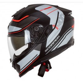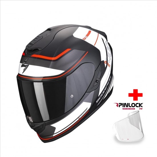--Visor solar interno antivaho y retráctil Pantalla incolora preparada para Pinlock MaxVision Pinlock MaxVision incluido. Se extiende hasta los bordes de la pantalla y ofrece así un campo de visión óptimo Sistema Ellip-Tech que facilita y agiliza el cambio de pantalla -- El Scorpion exo -1400 se sirve con pantalla transparente de serie --Las ventajas: Interior en tejido Kwikwick3, desmontable y lavable, que permite una mejor transpirabilidad gracias a una absorción más eficaz de la humedad Entradas de aire: orificios de ventilación delanteros y traseros, regulables Alerón trasero aerodinámico que reduce el levantamiento, crea una depresión y aumenta el flujo de aire a través del casco Sistema Kwikfit que facilita el uso de gafas