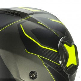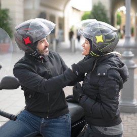 Demi jet con pantalla larga, que se extiende hasta cubrir la barbilla, con preparación por lente PINLOCK. Tiene una pantalla interna fumé retráctil, accionable por la rotación de la placa izquierda del casco. También está equipado con un sistema de ventilación AIR STREAM SYSTEM que consta de tomas de aire frontales que se pueden cerrar, conductos de aire en la calota interior y extractores traseros. El interior perforado, totalmente desmontable y lavable, está realizado con un top termoformado hexagonal para un mejor ajuste y tejido EXTRACOOL, extremadamente suave al contacto con la piel. Por último, están enriquecidos con bandas reflectantes traseras o en amarillo fluorescente de alta visibilidad para mejorar la seguridad pasiva.