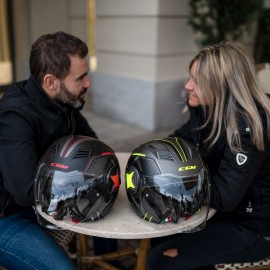 Demi jet con pantalla larga, que se extiende hasta cubrir la barbilla, con preparación por lente PINLOCK. Tiene una pantalla interna fumé retráctil, accionable por la rotación de la placa izquierda del casco. También está equipado con un sistema de ventilación AIR STREAM SYSTEM que consta de tomas de aire frontales que se pueden cerrar, conductos de aire en la calota interior y extractores traseros. El interior perforado, totalmente desmontable y lavable, está realizado con un top termoformado hexagonal para un mejor ajuste y tejido EXTRACOOL, extremadamente suave al contacto con la piel. Por último, están enriquecidos con bandas reflectantes traseras o en amarillo fluorescente de alta visibilidad para mejorar la seguridad pasiva.