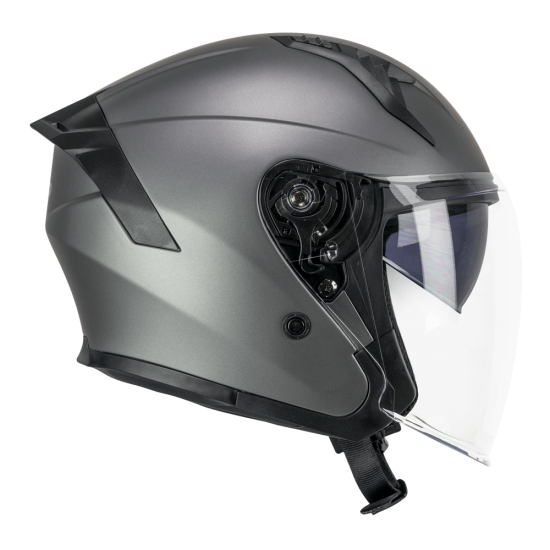 Casco jet de líneas agresivas con alerón trasero. Equipado con pantalla interior parasol retráctil y pantalla exterior basculante con un campo de visión muy amplio. El interior termoformado extraíble y lavable, el sistema de aireación interior, el anillo antirrobo de la correa y la hebilla micrométrica completan el equipamiento.