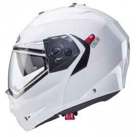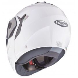Casco modular fabricado con carcasa de fibra de vidrio, cierre micrométrico y forro interior extraíble. Visor solar integrado y respiraderos en la barbilla.
