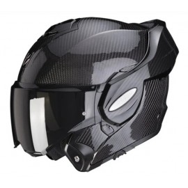 Casco Scorpion Exo-Tech Evo Carbon Negro. Casco modular muy versátil y funcional con calota exterior fabricada en fibra de carbono Ultra TCT® con homologación ECE 22-06. El Exo-Tech Carbon dispone de un práctico visor solar, acolchado interior Kwikwick3®, Pinlock Max Vision (incluido) y un eficaz sistema de ventilación. El casco dispone de homologación P/J para circular con total seguridad tanto con el casco cerrado en modo integral como con el casco abierto en modo jet. Destaca también la predisposición para instalar el sistema de comunicación Exo-Com (no incluido).