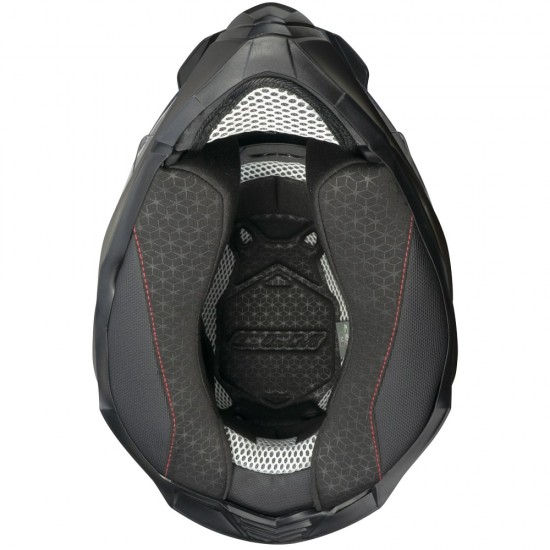 Equipado con una pantalla externa moldeada con perfil acanalado con predisposición Pinlock 70 no incluida, una pantalla parasol interna retráctil y una visera aerodinámica. Con ventilación Air Stream System de tres zonas y canalización interior. Interiores hexagonal termoformados desmontable para mayor comodidad en el ajuste, de tejido ExtraCool con malla blanca en contraste y con predisposición para intercomunicador. El equipo se completa con un deflector nasal, un deflector de barbilla y un tope de correa elástico.