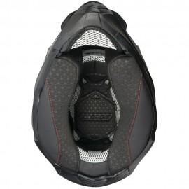 Interiores hexagonal termoformados desmontable para mayor comodidad en el ajuste, de tejido ExtraCool con malla blanca en contraste y con predisposición para intercomunicador. El equipo se completa con un deflector nasal, un deflector de barbilla y un tope de correa elástico.