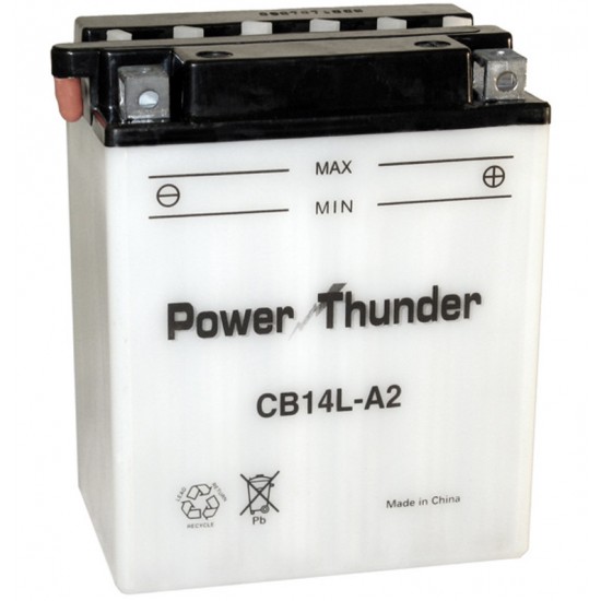 ensión : 12V Capacidad: 14 Ah (10h) Versión : Estándar activada : no CCA como fabricante: 180 A Longitud : 134 mm Anchura : 89 mm Altura : 164 mm Peso listo: 4.43 kg Pack de ácido incluido: Sí Cantidad ácido : 0.87 L Tipo de conexión : de arriba Terminal/Borne/Polo positivo: delante derecho Terminal/Borne/Polo negativo: delante izquierdo Drenaje de gas : izquierdo Fabricante : POWERTHUNDER