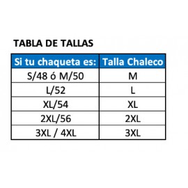 Si usas una chaqueta talla S/48 M/50, escoger la talla de chaleco talla M. Si usas una chaqueta talla L/52, escoger la talla de chaleco talla L Si usas una chaqueta talla XL/54, escoger la talla de chaleco talla XL Si usas una chaqueta talla 2XL/56,escoger la talla de chaleco talla 2XL Si usas una chaqueta talla 3XL o talla 4XL, escoger la talla de chaleco 3XL