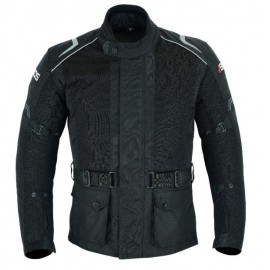 --Tejido realizado con cordura en --Nylon de alta y resistente a la abrasión. --Incorpora membrana impermeable y función cortaviento con forro anti-irritación. --Sistema ventilación "4 SEASONS" " frontal rejilla (Uso todo el año). -Protecciones "soft" homologadas CE-EN1621 extraíbles en hombros y codos. Espaldera foam incluida.. --Ajustable en cuello, muñecas y largos ajustes con velcro en cintura y brazos. --4 bolsillos exteriores (4 frontales + 1en espalda incluye chubasquero exterior para ponerlo por encima) --Tejido suave y anti-irritación en el interior del cuello. --Cómodos tiradores de goma en bolsillos y cremalleras dobles en muñecas para ajuste + función de entrada de aire. --Unión chaqueta-pantalón mediante cremallera.