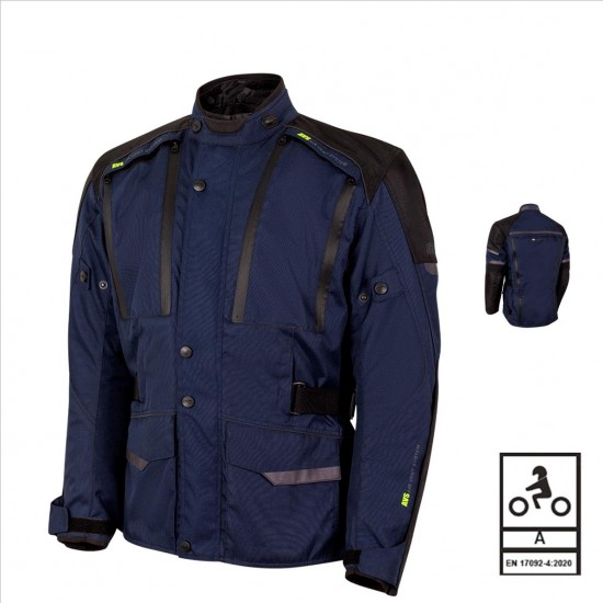 Tejido exterior en polyester 600D Zonas reflectantes Membrana Hi-Tex 100% Impermeable Forro Thermal Pro desmontable Ajuste en las mangas Ajuste en cintura multi regulable Ajuste de cuello regulable Ajuste de puño regulable Bolsillos exteriores e interiores Sistema de ventilación variable en zona pectoral, mangas y espalda Bolsillo trasero Cremalleras estancas Protecciones desmontables en codos y hombros, certificadas EN1621-1: 2012 CE Nivel 2. Bolsillo para protección de espalda, no incluida Producto certificado acorde a la norma europea prEN 17092-4: 2018 Nivel A