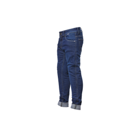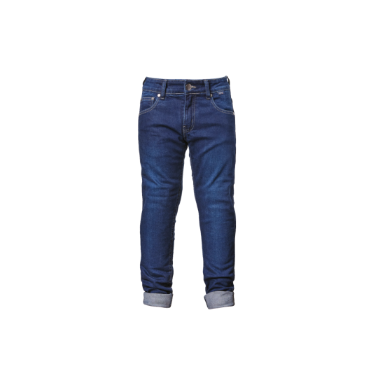 Material exterior 98% algodón, 2% elastano Forro protector en zonas con riesgo de caída (60% aramida (Kevlar®) y 40% poliéster) "5 bolsillos" (2 bolsillos delanteros, 2 bolsillos traseros, bolsillo para monedas) Forro de malla (100% poliéster) 4 tallas para niños Diseño probado según EN17092-3:2020 (AA) Kevlar® y DuPonttm son marcas comerciales o marcas comerciales registradas de EI du Pont de Nemours and Company.