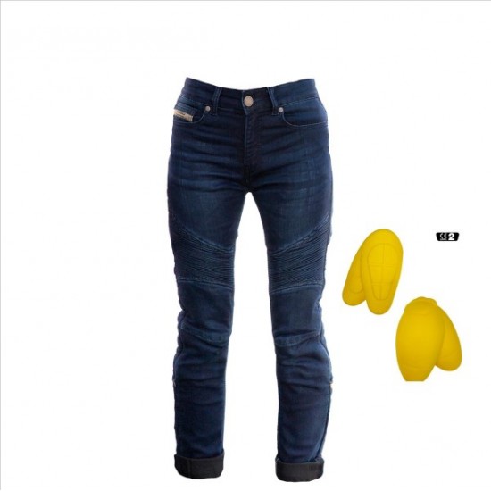 Posibilidad de insertar las protecciones con homologación CE de ON BOARD. Características: - 5 bolsillos exteriores (1 para monedas) - Amplia zona protegida contra la abrasión por fibras originales de Kevlar en glúteos, piernas y laterales (80% del área del pantalón total). - Protectores de rodilla de fácil inserción y extracción mediante bolsillo exterior con cremallera. 2 niveles para regular la altura de las rodilleras. - Ajuste de 2 niveles mediante soportes para regular la longitud de la pierna. - Protectores de rodilla y cadera certificados CE NIVEL 2 INCLUIDAS EN EL PRODUCTO . Se entregan desmontadas. - Cierre central con botón metálico y cremallera de alta calidad YKK con sistema "Lock" para que nunca se baje sola. - Amplias trabillas para cualquier tamaño de cinturón.