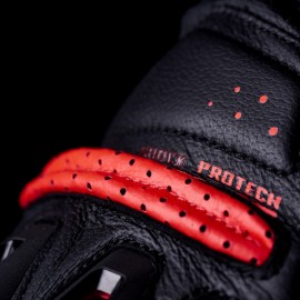 CARACTERÍSTICAS TÉCNICAS . Fabricación en piel flor de cabra en la parte superior combinada con piel sintética . Palma en piel flor de cabra para una mayor flexibilidad . Paneles flexibles de acordeón en piel sintética microperforada para optimizar la posición del protector de nudillos . Protección semi rígida AirGo Protech en los nudillos y metacarpiano . Protección en la palma en TPR ErgoProtech . Protección de dedos en TPR con entrada de aire . Protección del antebrazo ergonómica en TPR integrada con el puño . Banda antigiro entre los dedos anular y meñique para evitar que se separen en caso de caída . Sistema de doble cierre con lengüeta de velcro y lengüeta de ajuste del puño . Refuerzo Hi-Res Grip en la palma para un mejor agarre al manillar . Sistema touch screen compatible con pantallas táctiles . Homologación CE KP1