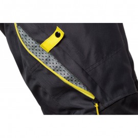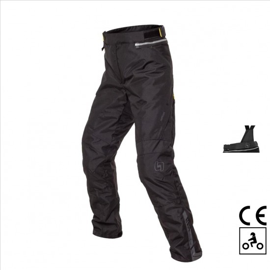 Tejido externo anti-abrasión 500D con tratamiento de repelencia al agua y revestimiento interior PU Elementos reflectantes en lateral y zona baja de la pierna para una mayor visibilidad Protecciones desmontables en rodillas con certificación CE de nivel 1 Espacio para la instalación de protección opcional en cadera