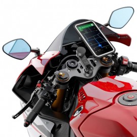 Compatible con la gran mayoría de los manillares de motocicletas (tubos de 2 a 5 cm de diámetro) sin tocar el depósito 3 tamaños de fundas compatibles con todas las marcas de teléfonos sin necesidad de retirar la funda protectora (ver listas más abajo) funda perfectamente táctil Protege de la lluvia Protege contra las vibraciones del motor Giro de 360° (paisaje / retrato / ...) Compatible con Face ID (Android) Apertura central para el puerto de carga USB